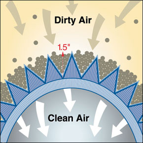 ​ ​短而硬的創新濾材褶裥,大大提高了粉塵捕捉和清灰效率。通過減短濾筒的褶高:從標準的50mm (2英寸) 縮短至38mm (1.5英寸),使褶壁不易折疊或彎曲,令攔截下來的粉塵更易被清出。