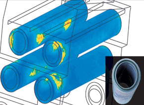 先進的FLUENT軟件模擬流體動力學,結構力學和聲學分別模擬了DFO型號1-12-23-3的性能等級。而下面(左圖)顯示了利用FLUENT軟件作流量測試,從而令DFO 3-3內部的氣流速度更均勻分布。另外下右圖顯示了利用ANSYS®*結構分析軟件測試DFO 3-3,在正常工作壓下之內部壓力分布測試。